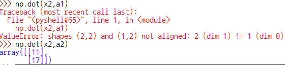 따라서 np.dot(x2,x1) 시에 연산이 가능! 결과도 [11,17]로 일치한다.